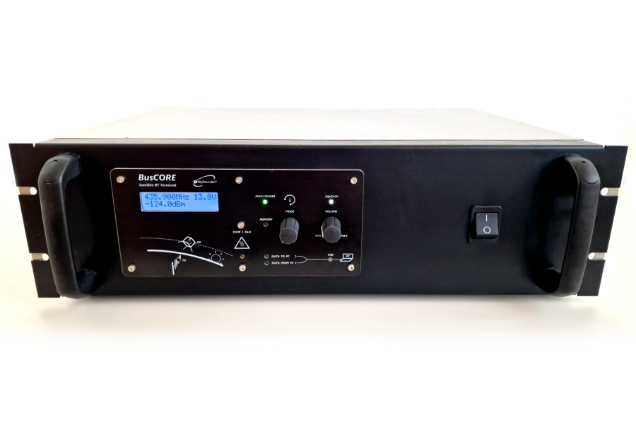 The BusCORE Groundstation Terminal is a Full Space-to-Earth, Earth-to-Space Radiocommunication Infrastructure, with 50 W Output Power, Excellent Sensitivity, Variable Bitrate Modulator/Demodulator, Superfast Solid State RX/TX Switch and RF Monitoring Output port for the external Spectrum Analyzer monitoring acitivities and USB port for a single cable connection to the control PC station.